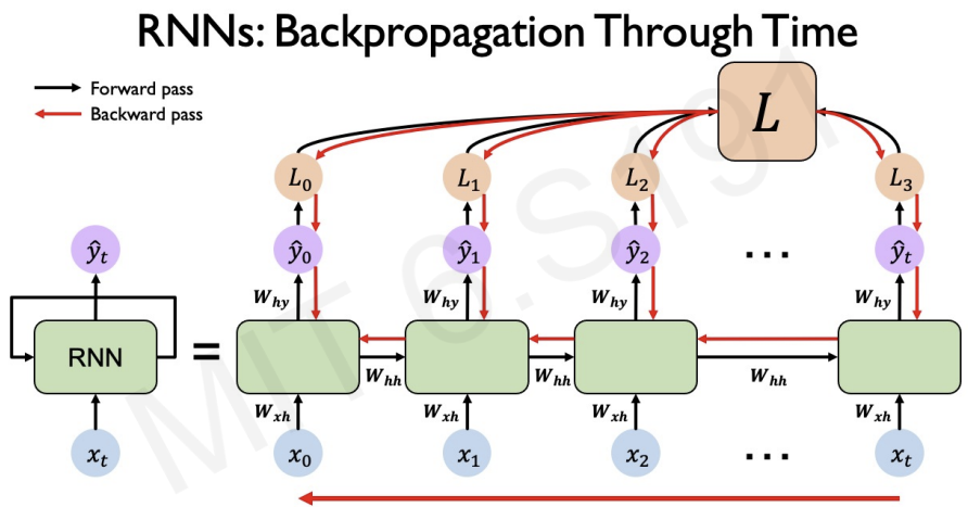 In RNNs sequence, we need to backpropagate the loss through each of these individual time steps.( the loss of RNNs is the sum of loss at individual time steps)