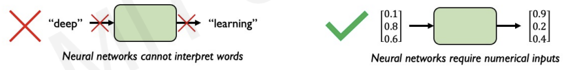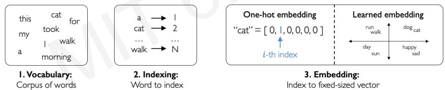 First, we define all the possible words that could occur in this vocabulary. Then we map these individual words to a numerical vector(fixed size). The mapping is also called one-hot-embedding.