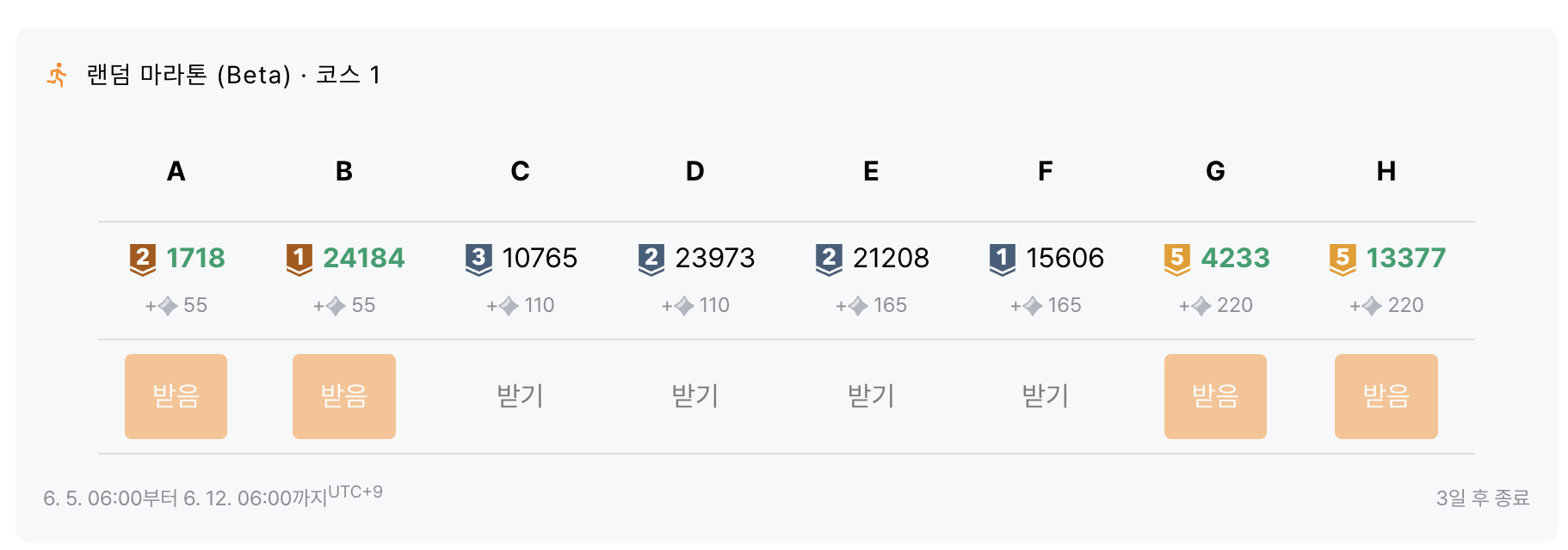 바로 마라톤이라는 시스템인데, 1주일마다 랜덤 8문제를 내주고 문제풀때마다 별가루/업적을 쌓는 시스템이다. 동기부여해주는거를 생각하면 정말 좋은시스템이다.