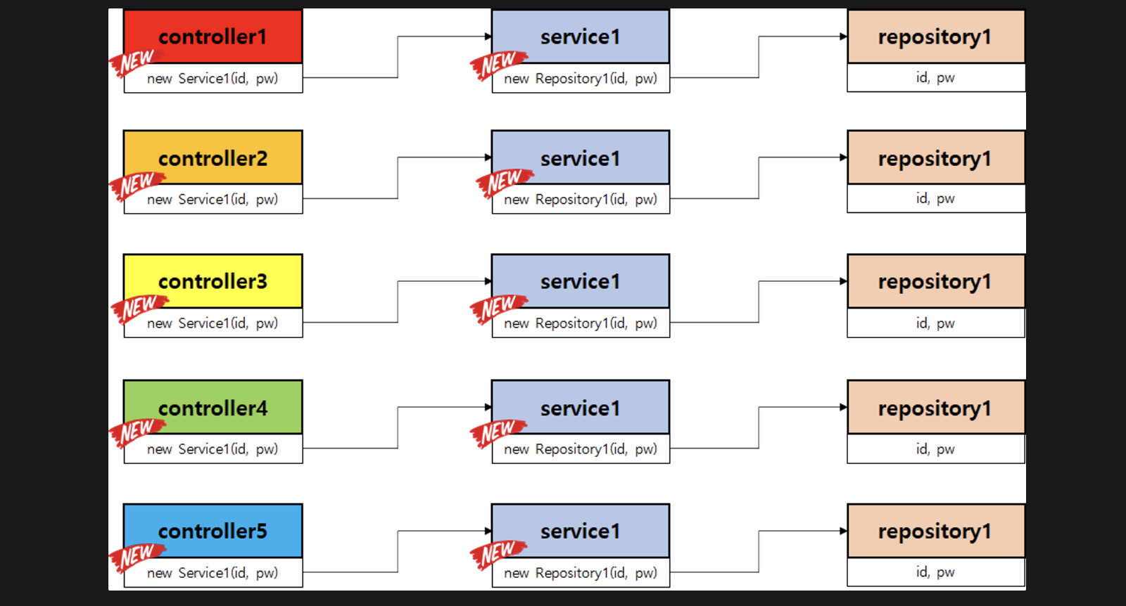 A의 생성자 필드값을 C 인스턴스로 수정하고 싶을때에도, 수정이 많이 필요하다.