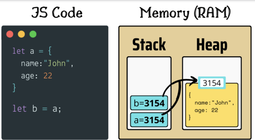 let a = { name : 'John', age : 22 } let b = Object.assign({},a); console.log(a===b) // false --> 변수의 재할당으로 복사는 했지만 스택의 서랍장 주소지가 다르기때문에 a===b 물어본결과 false 가 나오게 된것이다.