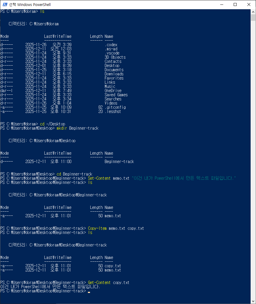 PS C:\Users\doram\Desktop\Beginner-track> Set-Content memo.txt "이건 내가 PowerShell에서 만든 텍스트 파일입니다."