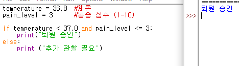 체온 37도 미만이면서 통증이 3 이하인 경우 "퇴원 승인"
