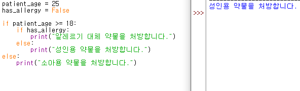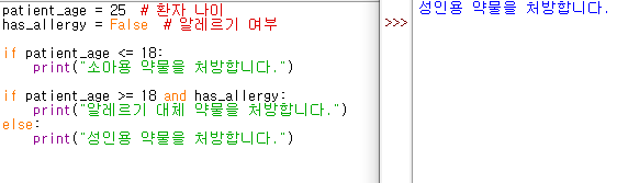 환자의 나이를 먼저 확인한 후, 성인(18세 이상)인 경우에만 알레르기 여부를 확인해서 처방을 결정하세요.