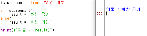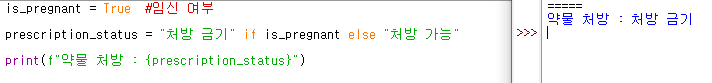 임신하지 않았으면 "처방 가능", 임신했으면 "처방 금기" 삼항 연산자를 사용하여 작성하세요.