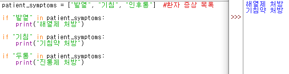 환자의 증상을 확인하여 해당하는 처방을 각각 출력하세요.