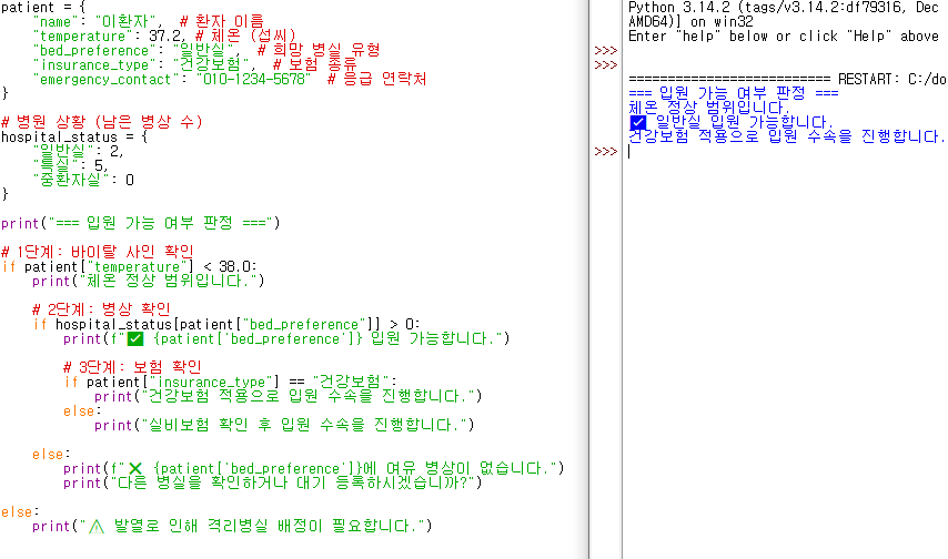 print(또는 함수명) 뒤에는 항상 괄호 !!!환자의 퇴원 조건을 확인하세요.