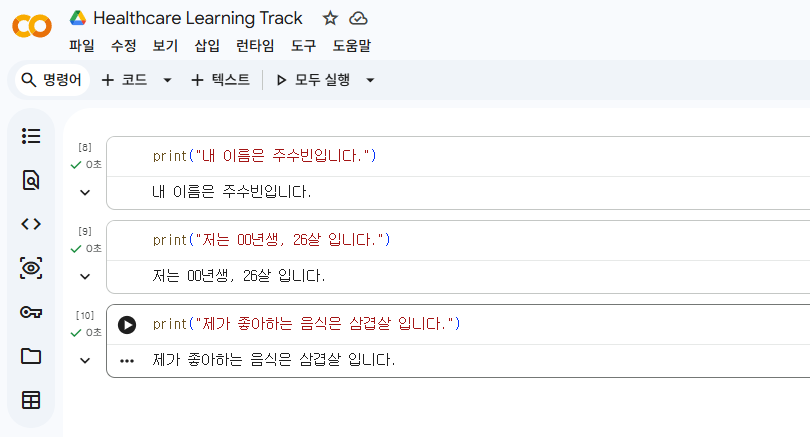 주석(#) 을 앞에 붙이면 코드에 작성하더라도 실행에서는 제외된다. 코드 본문에 메모를 남길때 사용한다.