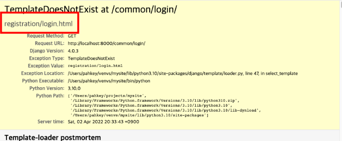 위 오류는 registration 디렉터리에 login.html 파일이 없음을 의미한다. 앞에서 사용한 LoginView는 registration이라는 템플릿 디렉터리에서 login.html 파일을 찾는다. 그런데 이 파일을 찾지 못해 오류가 발생한 것이다. 이 오류를 해결하려면 registration/login.html 템플릿 파일을 작성해야 한다.