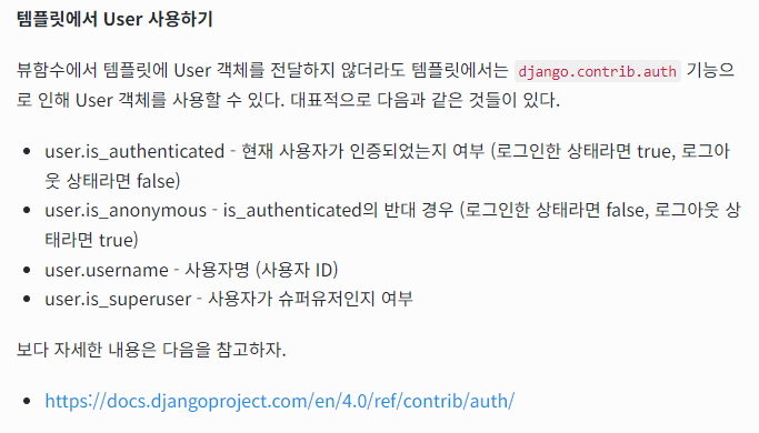 {% if user.is_authenticated %} 은 현재 사용자가 로그인 되었는지를 판별한다. 따라서 로그인이 되어 있으면 "로그아웃" 링크를 표시하고 로그인이 되어 있지 않다면 "로그인" 링크를 표시할 것이다.