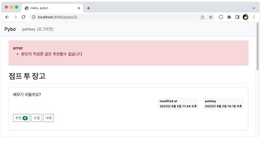 본인 추천을 방지하기 위해 로그인한 사용자와 추천하려는 질문의 글쓴이가 동일할 경우에는 추천할수 없게 하였다. 그리고 Post 모델의 voter는 여러사람을 추가할 수 있는 ManyToManyField이므로 post.voter.add(request.user) 처럼 add 함수를 사용하여 추천인을 추가한다.