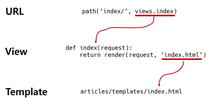 - 'views.py 파일은 View 함수 또는 클래스를 정의하고, 이러한 각각의 View 함수 또는 클래스는 클라이언트의 요청을 처리하고 그에 따른 응답(response)를 생성한다.