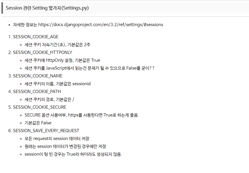settings 파일에 다음과 같이 세션쿠키의 만료 시점을 설정할 수 있다.
