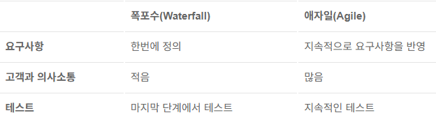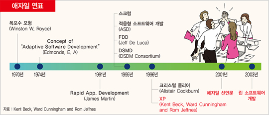 2001년 2월 11일에 발표된 소프트웨어 개발 방법론의 하나로, 1970년대부터 써먹었던 처음부터 끝까지 계획을 수립하고 개발하는 폭포수(Waterfall) 방법론과는 달리 개발과 함께 즉시 피드백을 받아서 유동적으로 개발하는 방법.