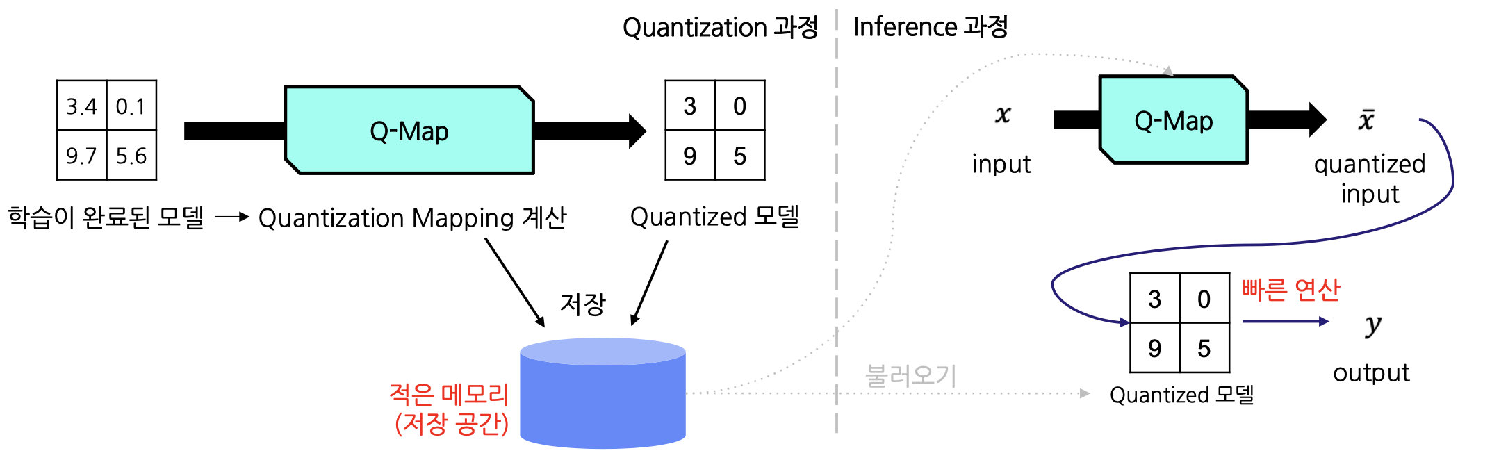 Quantization(양자화)은 모델의 가중치와 활성화를 낮은 비트 정밀도로 변환하여 저장 및 계산 효율성을 높이는 기법이다. 간단한 예를 들어, 의 값을 3.141592로 표현하면 정밀도는 높지만 메모리를 많이 차지하게 되고, 3으로 표현하면 정밀도는 낮지만 메모리를 적게 사용할 수 있기 때문에 후자의 표현으로 경량화를 하는 것이다. 하지만 계산 속도 향상과 메모리 효율성만을 생각하다가 모델의 성능이 크게 감소하면 곤란하기 때문에, 오차를 최소화하는 적절하게 낮은 정밀도를 찾는 것이 중요하다.