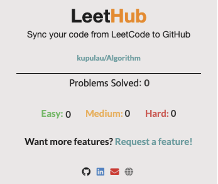 다만 LeetHub은 문제가 있는데, 분명 Submit으로 정답 코드를 제출했음에도 불구하고 코드가 업로드 되지 않는다. extension 창을 확인해보면 repository에 연동은 잘 되어 있지만 문제 푼 것을 인식 못하는 것처럼 보인다.