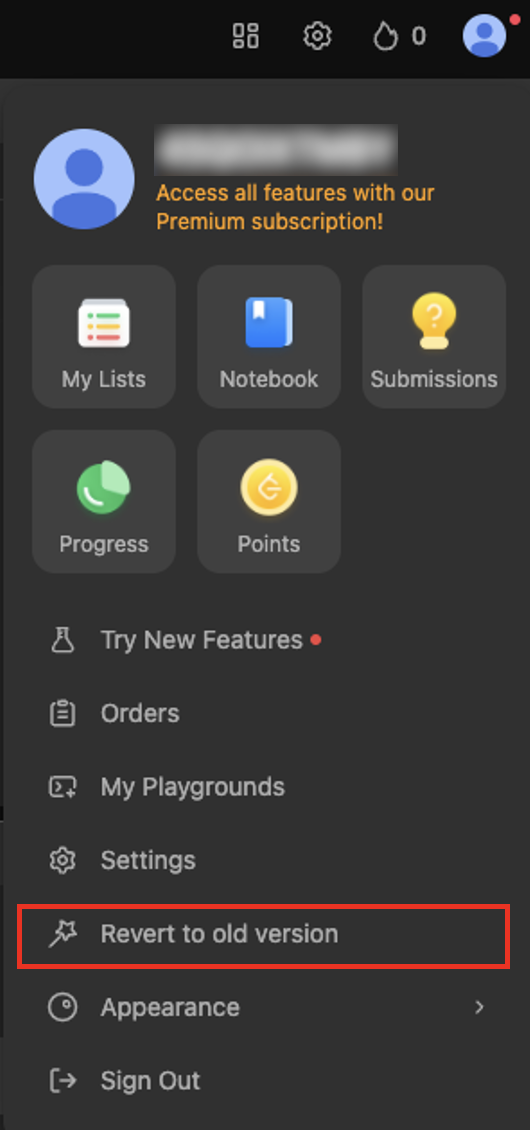 위와 같은 형태의 창이면 최신 UI로, Submit을 눌러도 문제 풀이가 인식되지 않는다. 이 때는 우측 상단의 프로필 클릭 > Revert to old version를 클릭해서 구버전 UI로 돌아가서 Submit하면 문제 풀이가 인식이 되면서 자동으로 repository에 코드가 저장이 된다.