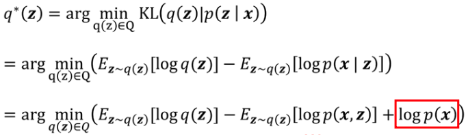 그래서 가장 적절한 q(z)를 설정하기 위해 Variational Inference 방법이 고안되었다. 이는 posterior probability 를 이용하는 방법인데, 저 숫자가 8이다 라는 선험적 지식을 바탕으로 z가 무엇인지 추정하는 것이다. 그러나 도 여전히 구해야하는 값이다. 이전의 Importance Sampling 방식이 중요도를 기반으로 Monte Carlo 계산ㅇ르 했다면, 여기서는 적절한 최적의 q(z)를 구하기 위해서 q(z)와 의 차이를 최소화하는 optimization problem으로 바꿔서 생각한다. 두 분포의 차이는 KL divergence를 이용해 구할 수 있으므로 이 최적화 문제를 이용해 최적의 q(z)를 찾는다.