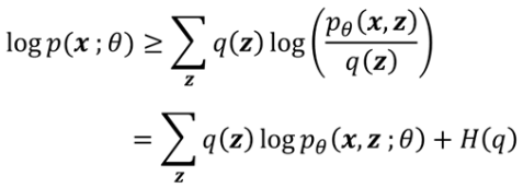그러나 이 역시 우리가 정확히 알지 못하는 가 포함되어 있는 것을 볼 수 있다. 이 문제를 해결하기 위해 ELBO (Evidence Lower BOund)라는 트릭을 사용한다. (중간 과정 생략...) 그러면 의 lower bound를 구할 수 있게 되고, q(z)와 의 분포가 같을 때에는 등식도 될 수 있다.