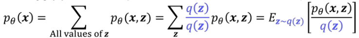 이런 점을 보완하고자 한 것이 Importance Sampling이다. 위 데이터에서 무작위로 z를 샘플링하지 않고, 가운데 부분이 흰색 (숫자 부분), 가장 자리 부분이 검은 색 (배경)일 확률이 크기 때문에 이러한 점을 고려해서 샘플링하는 것이다. 마찬가지로 수학적 트릭을 이용해 식을 다시 정리하면 q(z)라는 중요도를 반영한 확률 분포에서 z를 샘플링할 수 있다. 여기에 Monte Carlo를 이용해 계산하면 첫 번째 방법보다 효율적으로 를 근사할 수 있게 된다.