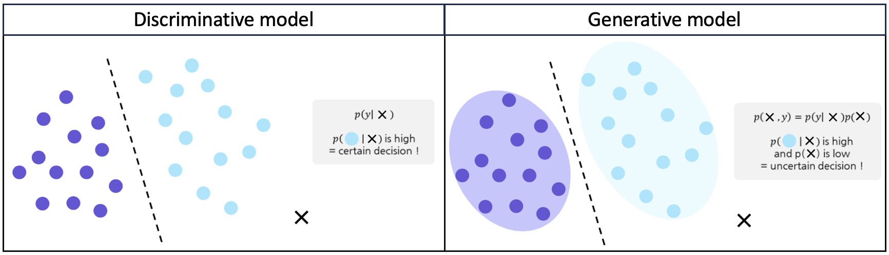 또한 를 잘 구할 수 있다면 생성 모델이 outlier를 고려한 더 정확한 분류를 할 가능성도 있다. 위 그림의 왼쪽 분류 모델을 보면, 새로운 데이터 가 들어왔을 때, 단순히 decision boundary의 오른쪽에 있기 때문에 하늘색 포인트와 같은 클래스로 분류될 것이다. 하지만 생성 모델은 데이터의 분포 까지 고려하여 분류를 하게 되기 때문에 가 decision boundary의 오른쪽에 있더라도 기존 데이터의 분포와 차이가 나는 것을 고려하여 outlier로 규정할 수 있게 된다.