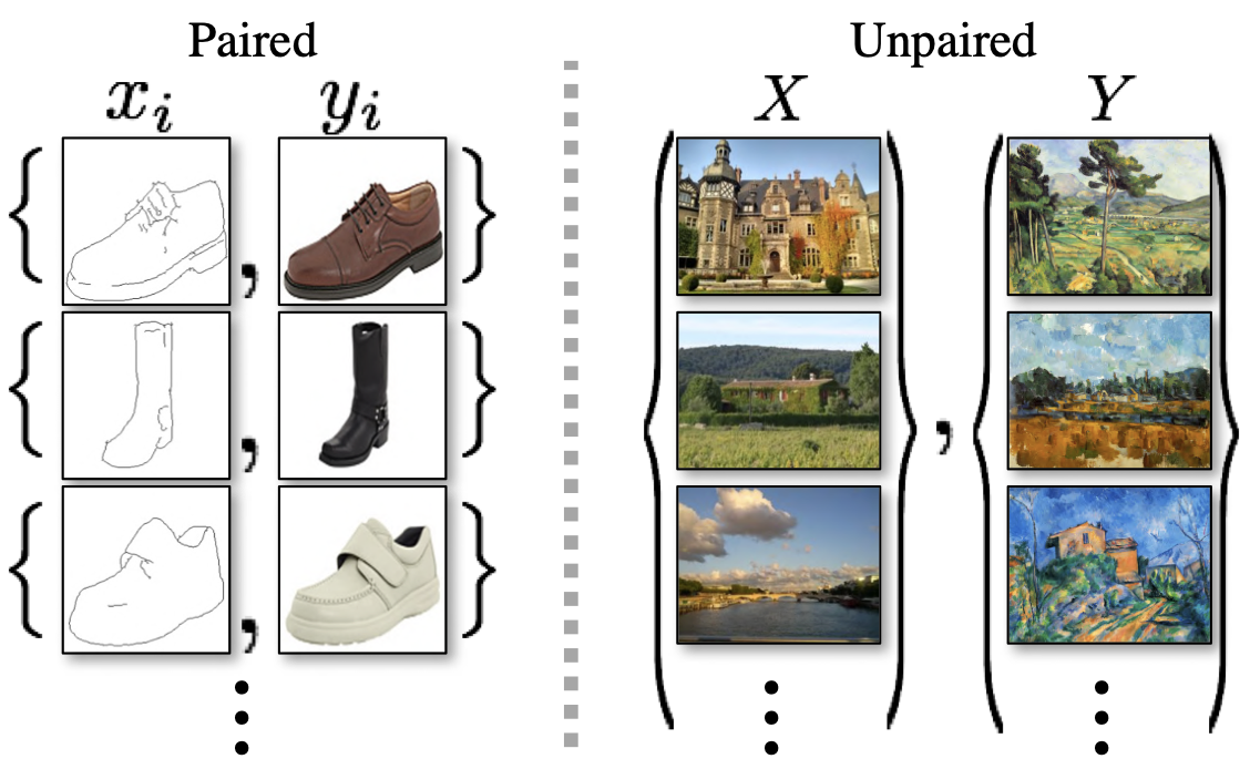 이에 반해 unpaired image는 한 쌍의 이미지가 1:1로 직접적으로 관련되지 않는 이미지이다. 성의 실제 사진 - 숲의 유화 이미지 쌍, 낮의 강 사진 - 밤의 저택 유화 이미지 쌍처럼 두 이미지가 직접 관련은 없다. 그러나 이는 두 이미지가 전혀 관련성이 없이 무작위로 매치되었다는 의미는 아니다. 이 이미지 쌍들은 1:1 직접 매칭이 없을 뿐 "실제 사진"과 "유화 이미지"라는 도메인의 분포 차이를 학습시키려는 쌍이다.