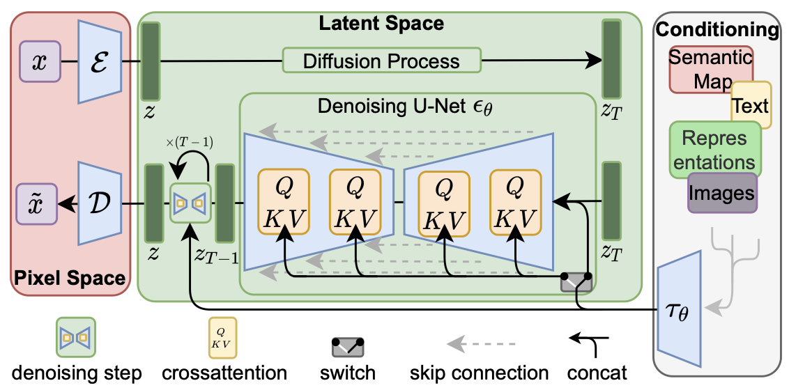 encoder를 통해 입력 이미지가 latent space로 입력되고, latent space에서 diffusion 모델을 적용해 노이즈를 더하고 제거해서 생성된 이미지를 decoder에서 원본 이미지 공간으로 복원한다. 이 때 cross attention을 통해 latent space에 condition embedding을 반영할 수 있다. 이는 입력한 조건에 부합한 이미지가 생성되도록 조정한다.
