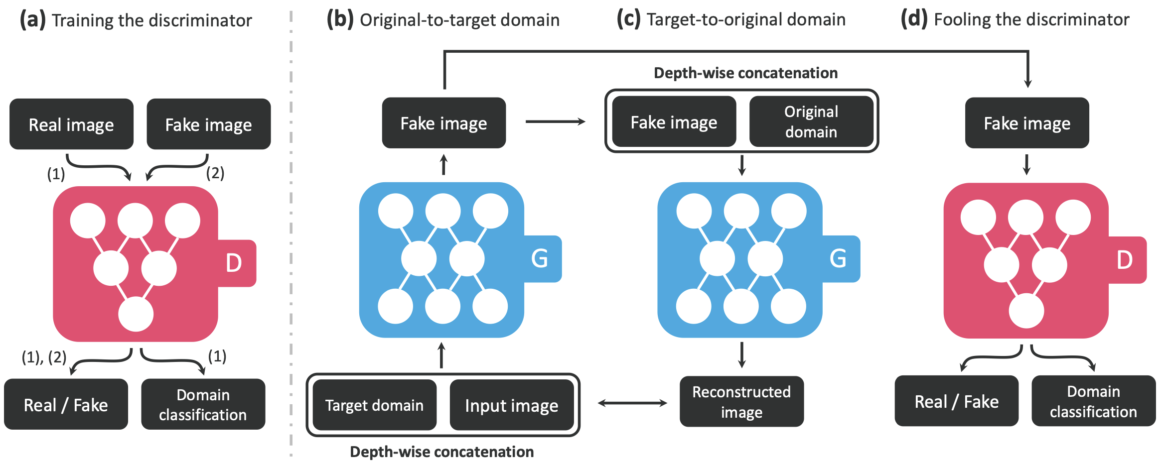 StarGAN에서는 하나의 생성 모델로 여러 도메인을 반영하도록 목적 함수에 adversarial training loss, classification loss, cycle consistency loss를 사용한다.