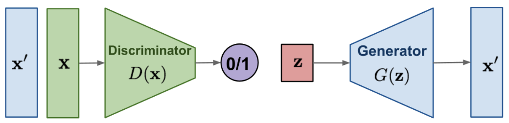 GAN(Generative Adversarial Networks)은 판별자(discriminator)와 생성자(generator)를 적대적으로 학습하는 모델 구조이다. 판별자는 입력 이미지가 생성된 이미지인지 진짜 이미지인지를 잘 판별하도록 학습하고, 생성자는 잠재 변수 z를 입력으로 받아서 학습 데이터의 분포에 가까운 이미지를 생성하도록 (즉, 진짜 이미지처럼 생성하도록) 학습한다. 다시 말하면 데이터의 생성 여부 판단 가능성을 "판별자는 maximize"하도록, "생성자는 minimize"하도록 학습하는 것이다.
