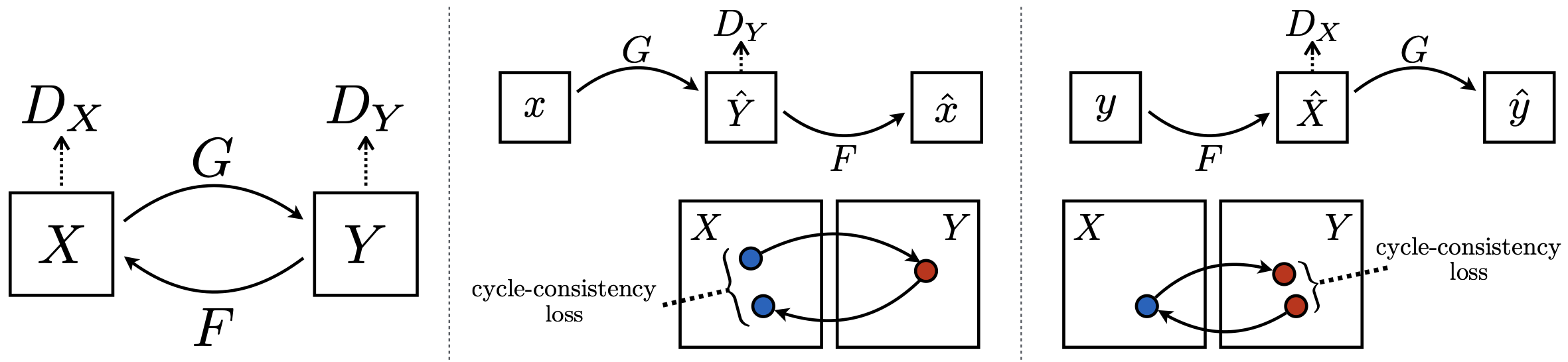 다시 본론으로 돌아와서, cycle consistency loss란, 직접적으로 1:1 매칭이 되지 않는 unpaired image에 대해 이미지 생성을 잘 학습시키기 위한 손실 함수이다. 기본적인 아이디어는 도메인 X에서 도메인 Y로 변환한 후, 이를 다시 도메인 X로 복구했을 때 (X → Y → X) 원본 이미지와 최대한 비슷하게 만들어야 한다는 것이다. 반대로, 도메인 Y에서 도메인 X로 변환한 후, 이를 다시 도메인 Y로 복구했을 때 (Y → X → Y)에도 마찬가지로 원본 이미지와 최대한 비슷하게 만들어야 한다. 이러한 과정을 거치면, 변환의 신뢰성과 일관성을 보장할 수 있을 것이라는 아이디어이다.