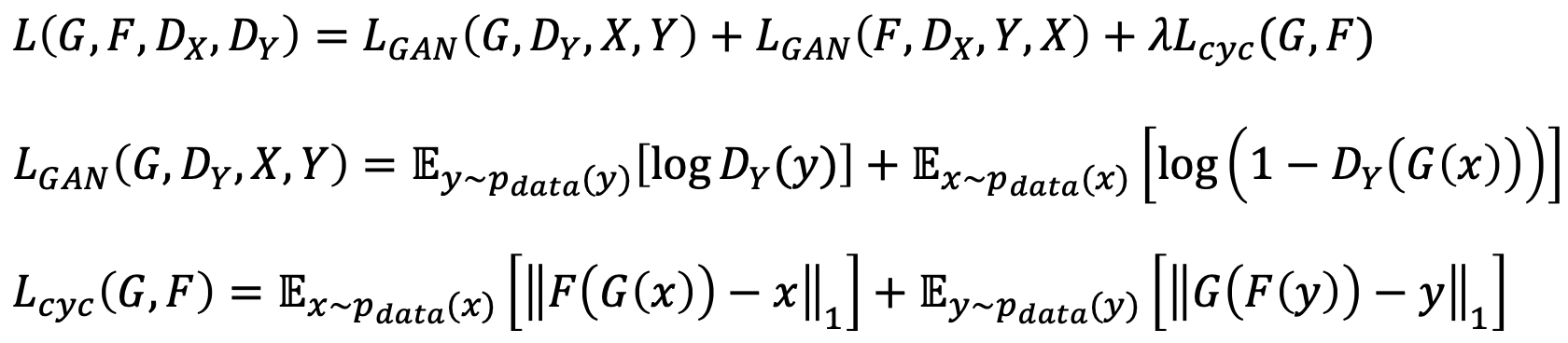 이 때 X에서 Y로 변환하는 생성자를 G라고 하고, Y에서 X로 변환하는 생성자를 F라고 하자. 그리고 도메인 X에서 진짜 이미지인지 생성된 이미지인지 판별하는 판별자를 , 도메인 Y에서 생성된 이미지인지 생성된 이미지인지 판별하는 판별자를 라고 하자. 학습을 위한 목적 함수()는 과 로 구성된다. 은 GAN 학습을 위한 adversarial training loss이고, 은 cycle consistency loss로, 생성한 이미지를 다시 원본 이미지로 생성했을 때 consistency를 유지하기 위한 손실 함수이다. 이 목적 함수를 이용하면 unpaired image 쌍을 이용할 때에도 학습을 잘 시킬 수 있게 된다.