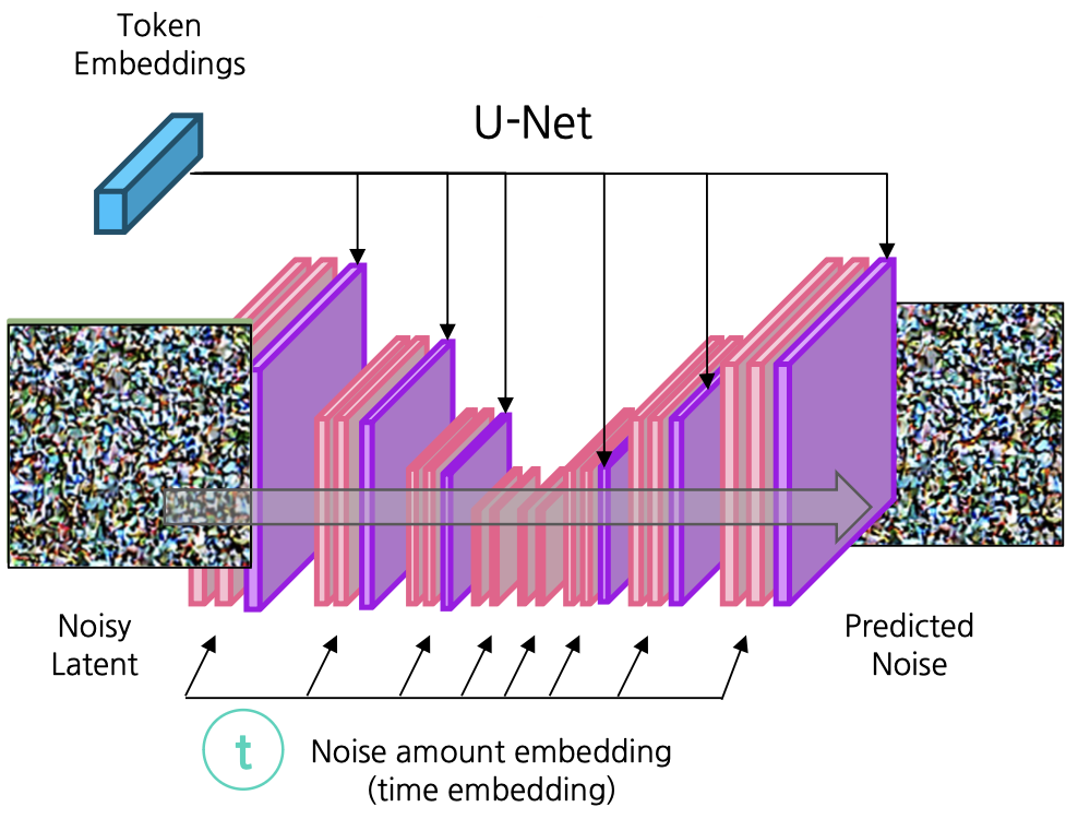 그러면 noisy latent와 time embedding을 input으로 받고, text encoder의 결과물인 token embedding과 cross attention을 이용해 (key, value : token embedding, query : noisy latent) 결합한다. 이 정보들을 이용해 가해진 noise를 예측한다.
