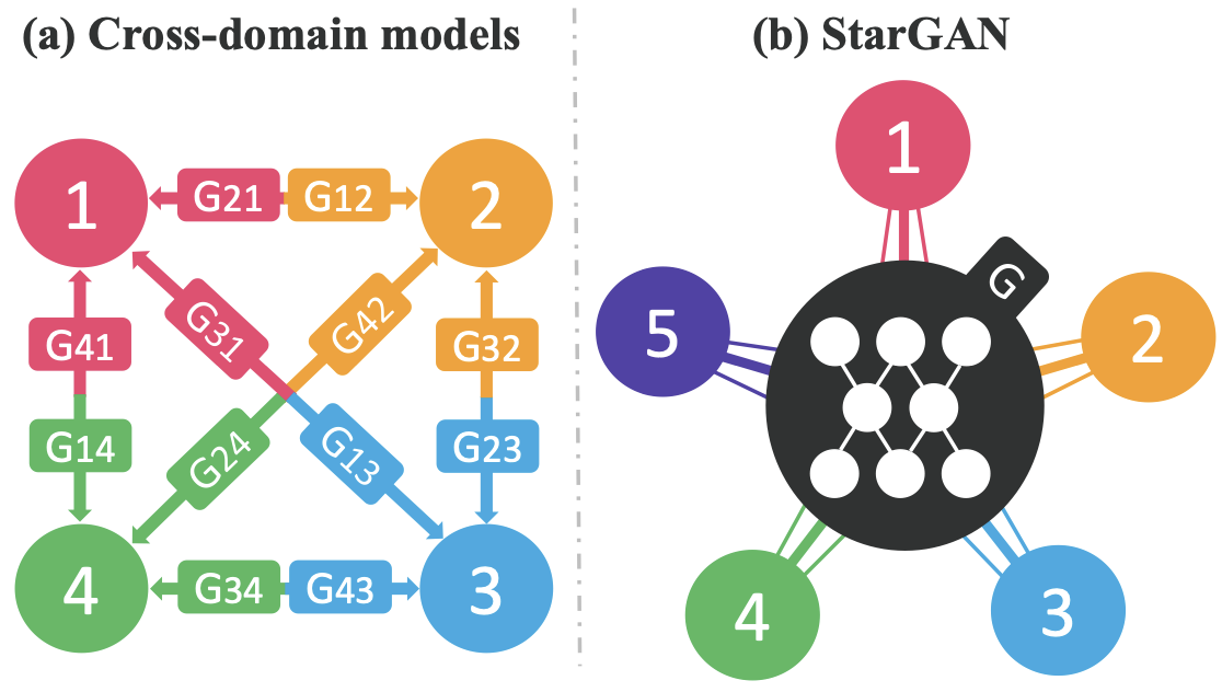 사용자의 수요에 따라, 이미지 생성 모델은 다양한 도메인을 다뤄야 할 것이다. 그러나 도메인 별로 생성 모델을 만드는 것은 어려운 일이다. 이에 단일 생성 모델만으로 여러 도메인을 반영할 수 있는 구조를 제안한 것이 StarGAN이다.