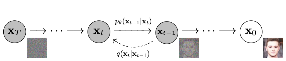 DDPM(Denoising Diffusion Probabilistic Models)은 입력 이미지를 forward process를 통해 잠재 공간으로 변환하고 reverse process로 복원하여 이미지를 생성하는 모델이다. forward proces에서는 점진적으로 Gaussian noise를 추가하여 잠재 공간으로 매핑하고, reverse process에서는 forward process에서 추가된 노이즈를 추정하여 제거한다.