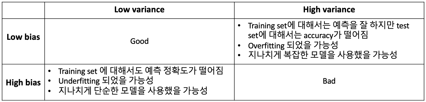 실제 머신 러닝에서는 training set의 예측값을 통해 bias를 파악하고, test set의 예측값을 통해 variance를 파악하면 된다.