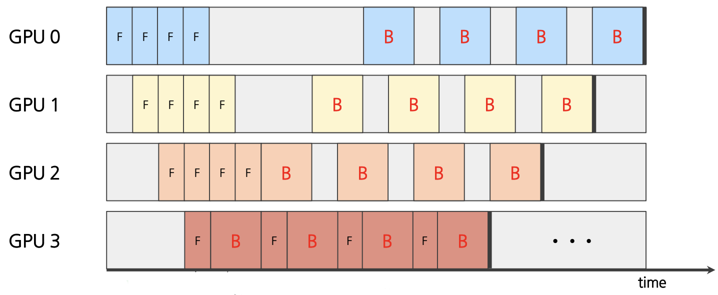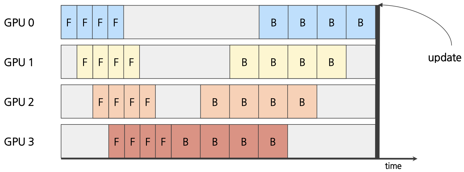 우선 모델을 연속적인 여러 스테이지로 나누어 각 스테이지들을 GPU에 할당한다. 그리도 데이터 batch를 micro-batch 단위로 작게 쪼갠 뒤 데이터를 순차적으로 주입한다. 이 때 batch를 잘게 쪼개서 연산을 일찍 끝낼수록 뒤에 있는 layer 사이의 bubble (아래 참조)이 적게 발생하지만, 너무 작게 분해할 경우 스테이지 간 통신이 너무 빈번해져서 더 오래 걸릴 수 있다. backward process에서는 micro-batch들이 스테이지에 들어간 역순으로 gradient가 계산되고 모델이 업데이트 된다.