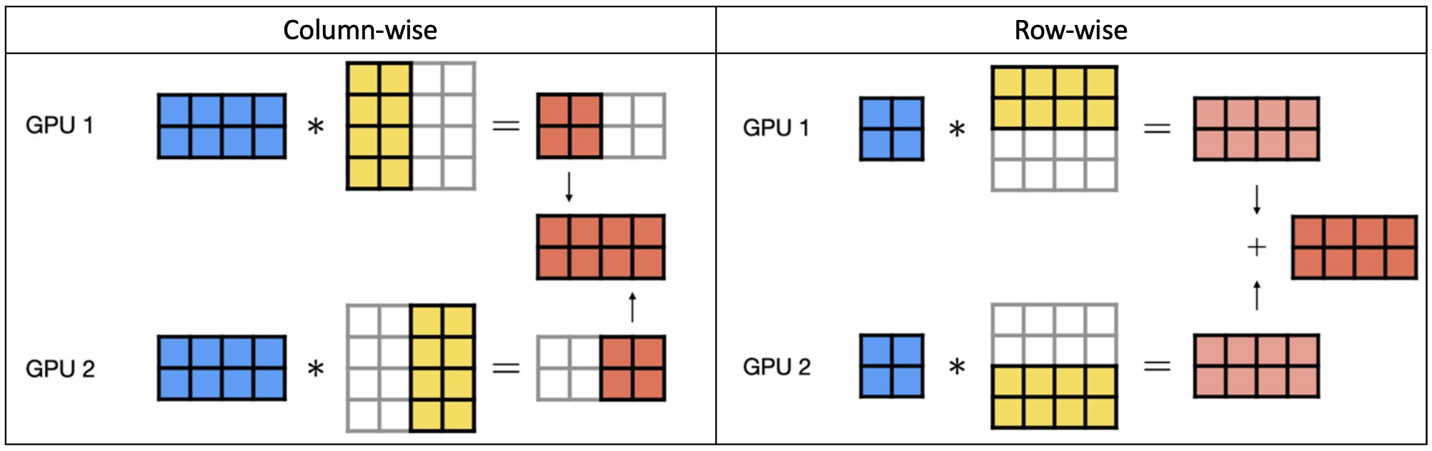 모델을 텐서 연산 단위로 여러 GPU에 나누어 계산하는 방식이다. 텐서 연산은 input weights = outputs과 같은 방식인데 주로 weights 행렬을 나누어 연산한다. 이는 다시 텐서를 어느 방향으로 나눌 것인지에 따라 column-wise (열 방향으로 쪼개기), row-wise (행 방향으로 쪼개기)로 나뉜다. row-wise 연산을 하려면 input도 함께 쪼개줘야 한다.