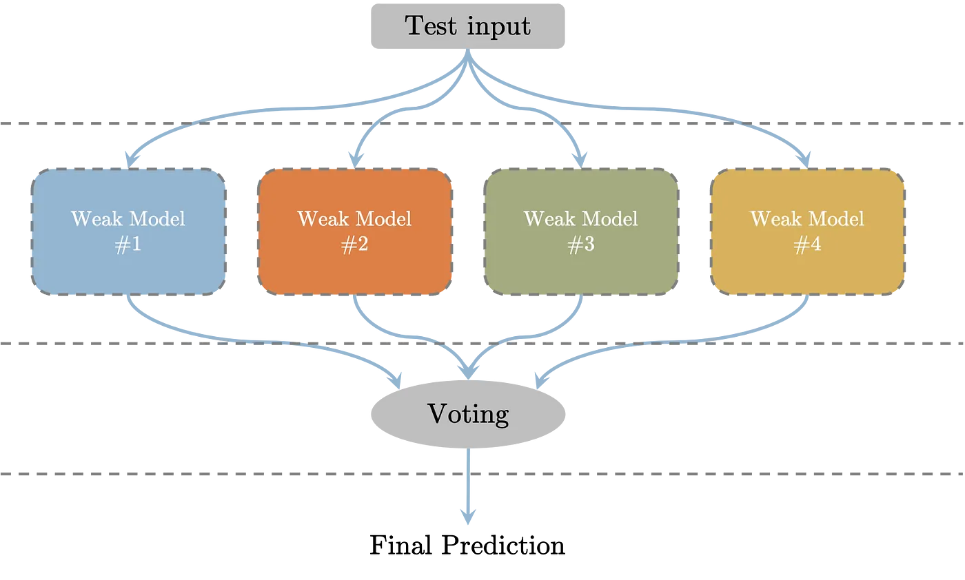Ensemble은 머신 러닝의 다양한 기법들 중 하나로, 여러 개의 간단한 모델(weak learner이라 부른다.)을 생성한 후 그 모델들의 예측값을 종합하여 하나의 최종 모델 또는 예측값을 도출하는 것이다. 아래의 그림이 ensemble 기법을 잘 보여주고 있다.