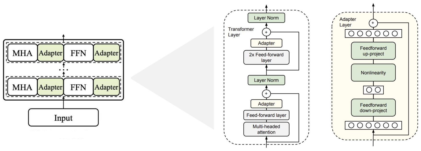 기존에 이미 학습이 완료된 모델의 각 레이어에 학습 가능한 Feed Foward Network(FFN)를 삽입하는 구조이다. Adapter layer는 transformer의 vector를 더 작은 차원으로 압축한 후에 비선형 변환을 거쳐 원래 차원으로 복원하는 병목 구조로 이루어진다.