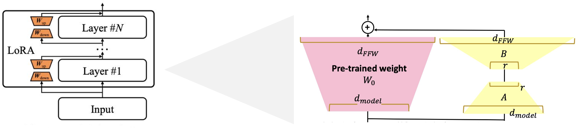 사전 학습된 모델의 파라미터를 고정하고 학습 가능한 rank decomposition 행렬을 삽입하는 방법이다. 이 행렬은 행렬의 차원을 rank 만큼 줄이는 행렬과, 다시 원래 차원 크기로 바꿔주는 행렬로 구성된다. 레이어마다 hidden states에 lora parameter를 더해서 tuning한다.