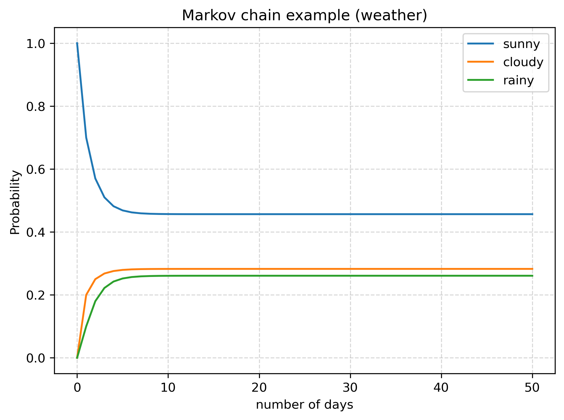 전이 행렬이 , 초기 상태 분포를 라 하면 t일 후의 상태 분포 는 와 같다.