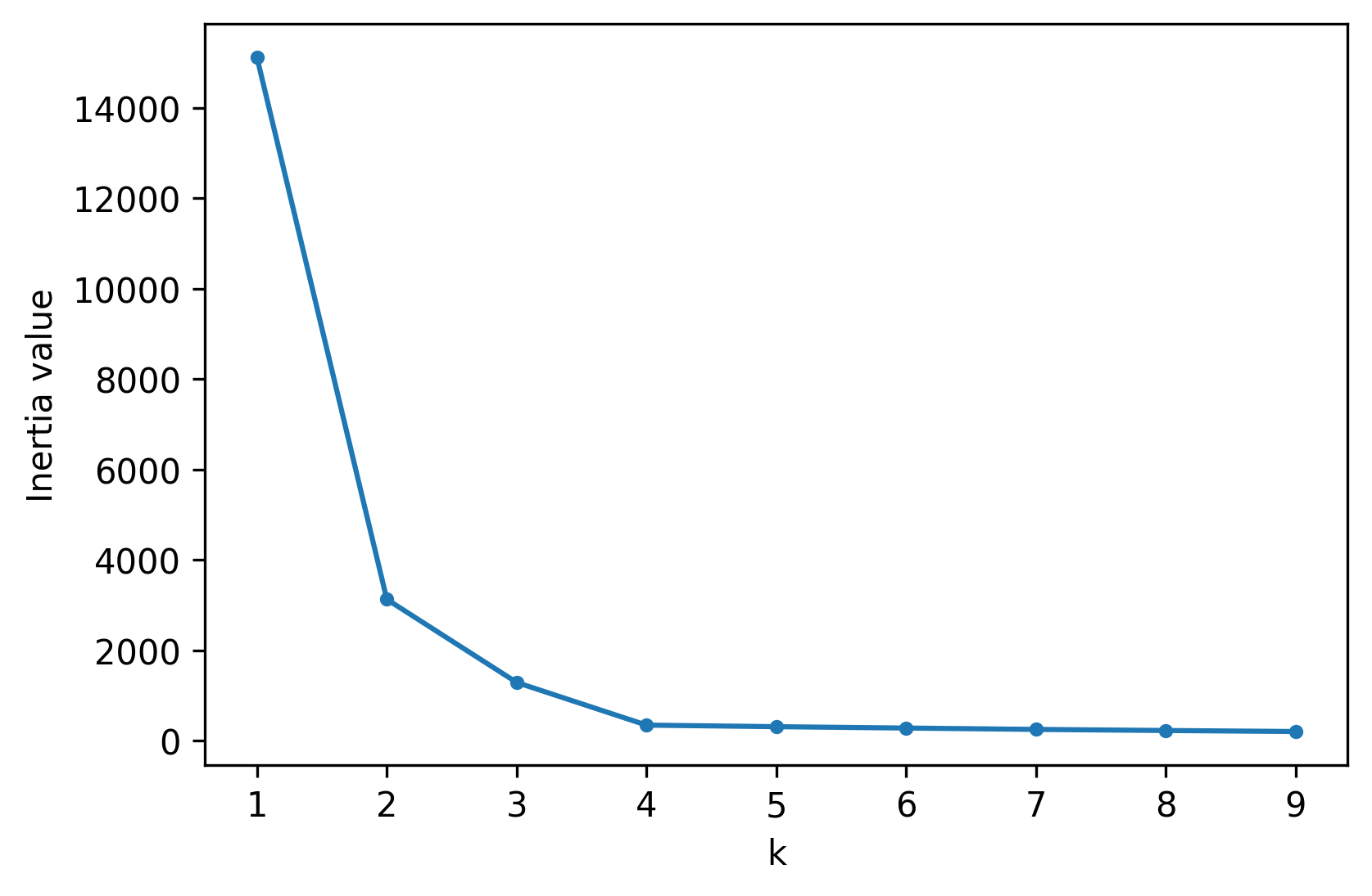그러나 보통은 데이터가 몇 개의 그룹으로 나누어질지 알 수 없는 경우가 대부분이다. 이 때 inertia value를 이용해 k 값을 미리 추정할 수 있다. inertia value는 clustering 작업이 끝난 후, 각 centroid에서 그룹으로 분류된 데이터 간의 거리를 합산한 값이다. 즉, inertia value가 작을수록 clustering이 잘 되었다고 판단할 수 있다. 따라서 가능한 inertia value의 범위를 정해 반복문으로 테스트를 해보고, inertia value가 일정 값으로 수렴하면 그 값을 전후해 k 값을 정하면 된다.