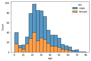 sns.histplot(x='age', data=tbl, hue='sex', multiple='stack')