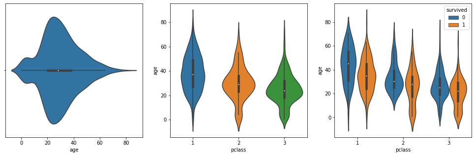 sns.violinplot(x='pclass', y='age', hue='survived', data=tbl) # subplot 3