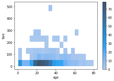 sns.histplot(x='age', y='fare', data=tbl, bins=(20, 10), cbar=True)
