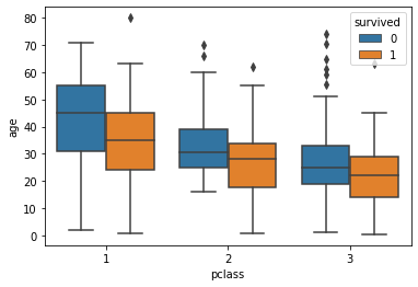 sns.boxplot(x='pclass', y='age', hue='survived', data=tbl)