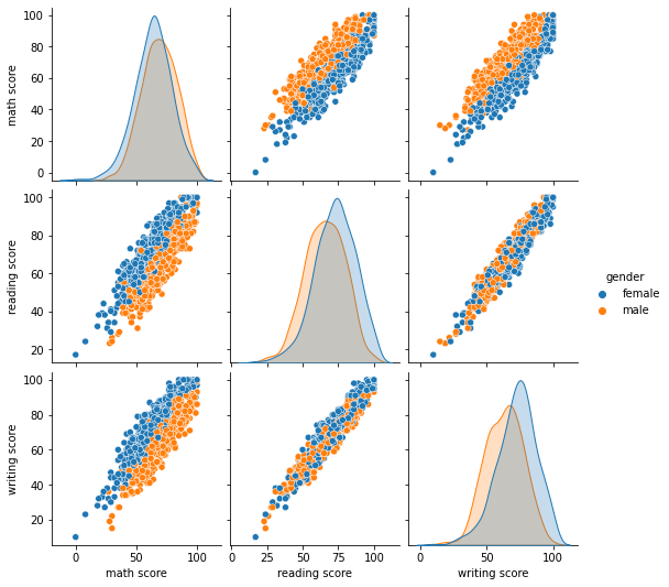 sns.pairplot(data=tbl, hue='gender') # StudentPerformance.csv