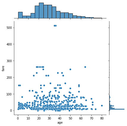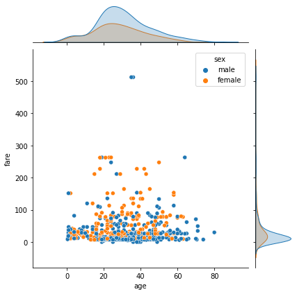 sns.jointplot(x='age', y='fare', hue='sex', data=tbl)