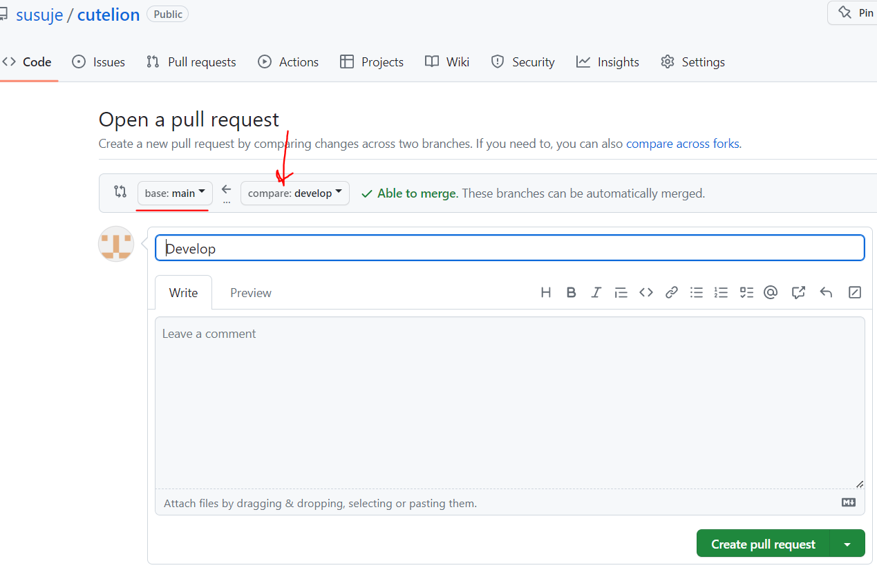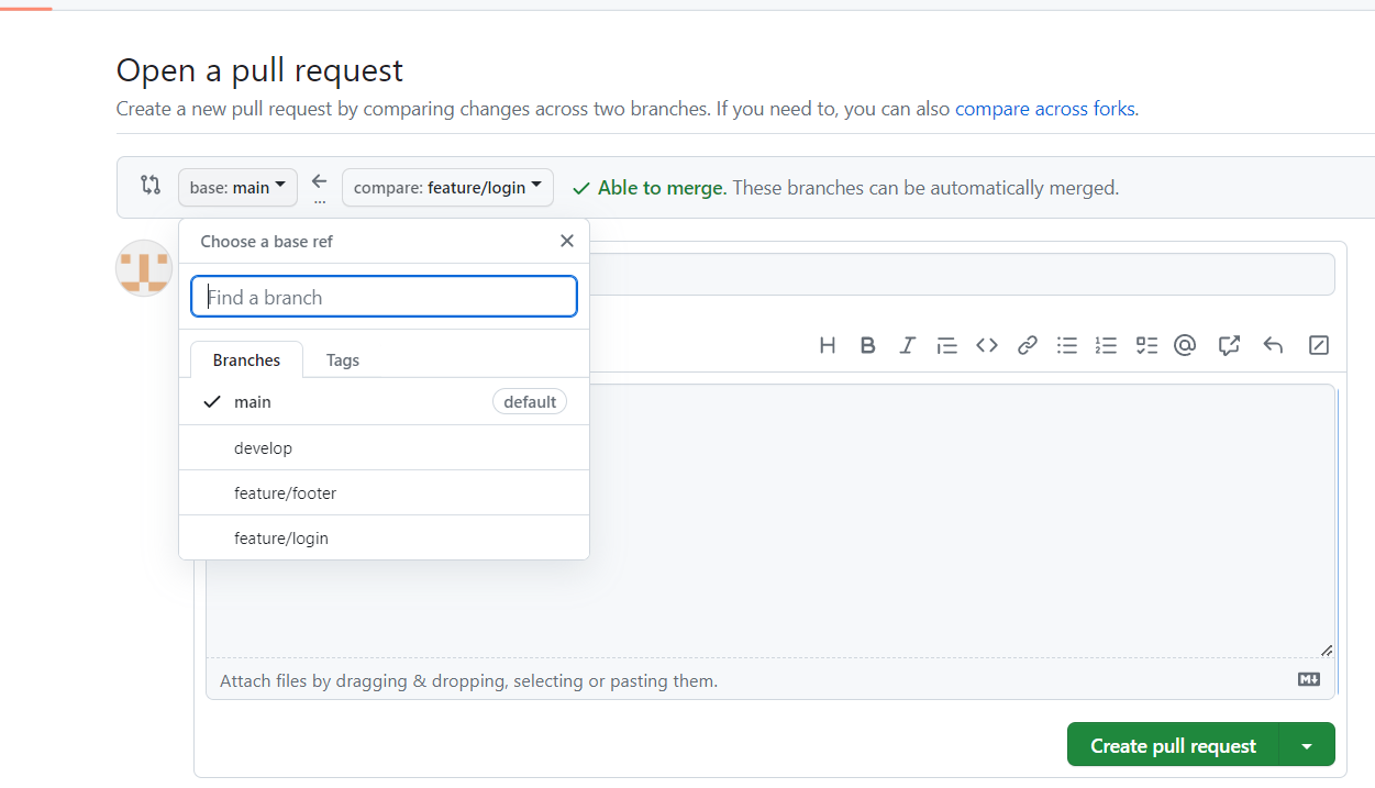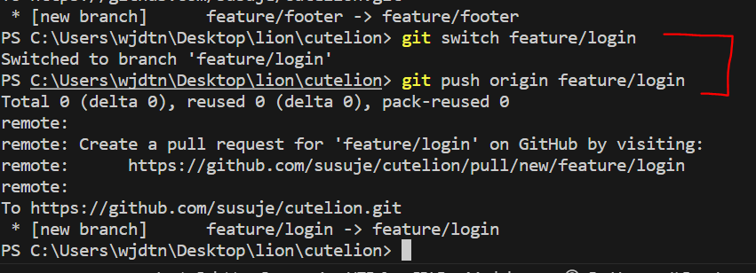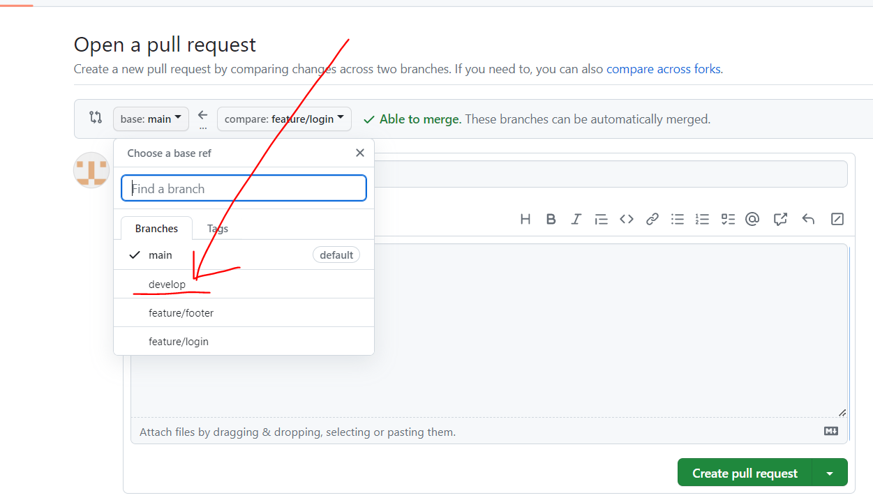 이제 깃헙에 올리면 develop 중간관리자 브랜치에게 가야함.