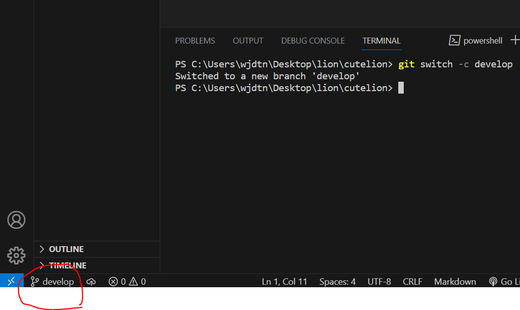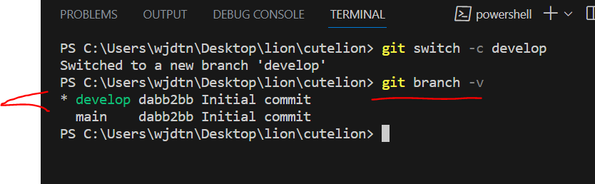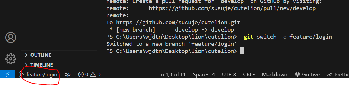 브랜치를 현재 로컬(내컴터)에 생성했다.